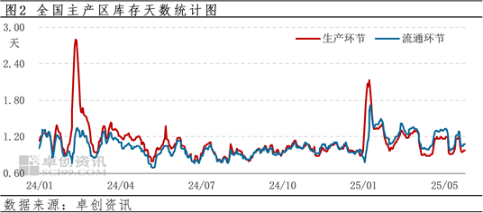 库存:今日全国生产环节平均库存0.98天左右,流通环节库存1.07天左右。