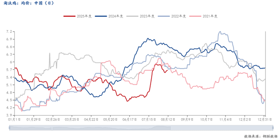 如图所示,2025年蛋鸡已经走出相当有特色的一年,20年上半年走势接近于2025年上半年,蛋进入下半年后淘鸡加速,下半年蛋价走高,而25年目前尚未看到超淘迹象,或许临近中秋有集中淘汰预期。如此高的存栏量只能通过冲淘鸡降低供应方面压力,不过,些许利好的是春节后的换羽鸡中秋前后必须要淘汰,行情的转折大概率发生在何时淘鸡放量。