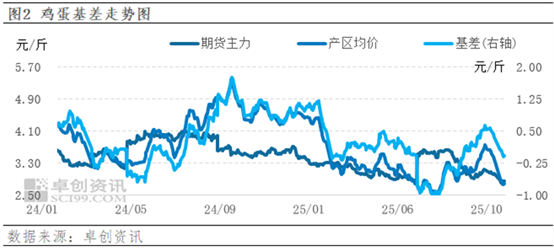本周鸡蛋期货主力合约2511行情先涨后跌,最低收盘价格为2808元/500千克,最高价格为2855元/500千克。周一期货开盘短暂低位震荡后,盘面触底上涨,期价最高涨至2870元/500千克附近。之后再涨乏力,盘面震荡调整。周四盘面转弱,期价承压回落跌至2820元/500千克附近。截止到本周四合约2511收于2818元/500千克,目前期现货基差在72元/500千克。