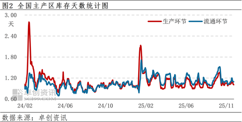 库存:今日全国生产环节平均库存1.01天左右,流通环节库存1.09天左右。