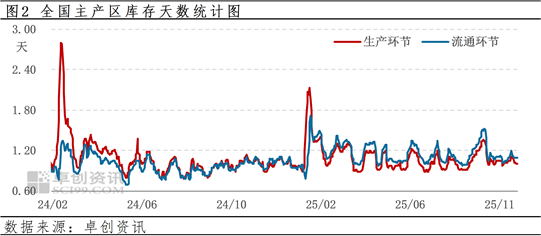 库存:今日全国生产环节平均库存1.01天左右,流通环节库存1.09天左右