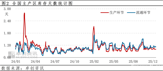 库存:今日全国生产环节平均库存1.00天左右,流通环节库存1.12天左右。